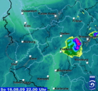 Tagbeginn Hochnebel, Auflösung, Wolkenloser Himmel 21,00MESZ Aufzug von Gewitterwolken, heftige Windböen Stärke 8, Gewitter um 21,15 MESZ, 21,30MESZ ende des Unwetters