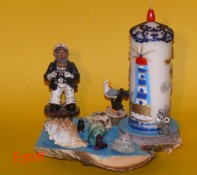 Seemann mit “Leuchtturm im Wasser”, Wasser auf Birkenholz, Zuschnitt, Leuchtturm ist Kerze.
