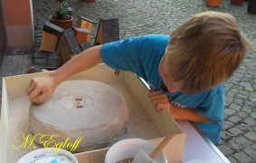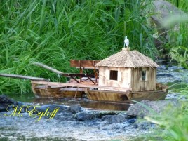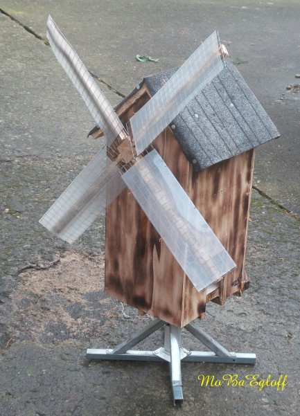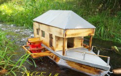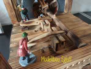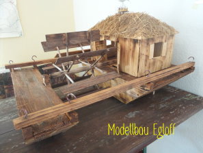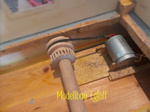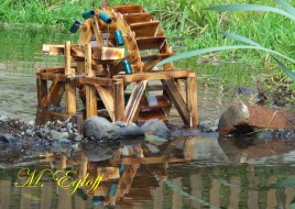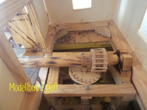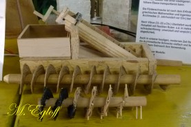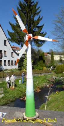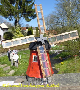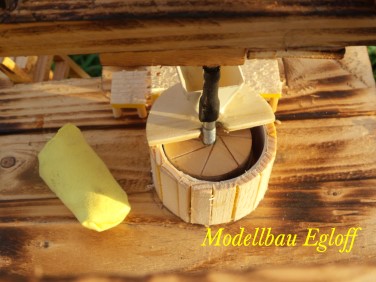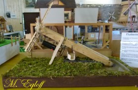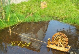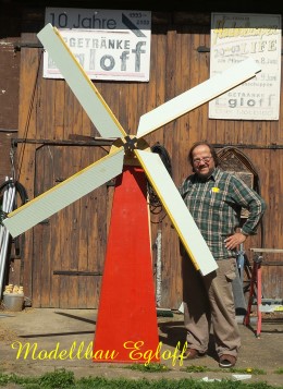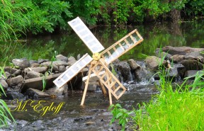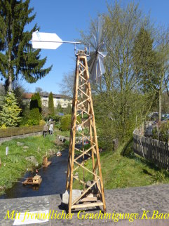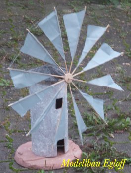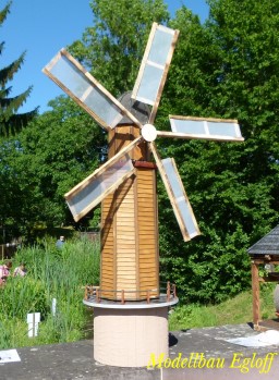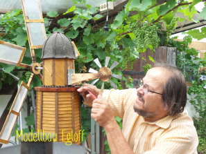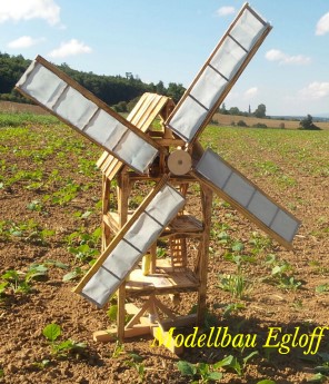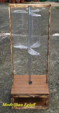 Die Flutter- Mühle wurde von den Holländer im 17 Jahrhundert erfunden. Eine Archimedische Schraube mit einem Windflügel, sie ist die erste bekannte mobile Windmühle ihrer Art. Mit dem Flutter wurden Polder be- bzw entwässert. Mit 3 - 5 m Länge konnte sie an jeden Ort gebracht werden, wo sie gebraucht wurde (Bild oben das Wassermodell, unten die Tischversion mit Batterieantrieb) |
