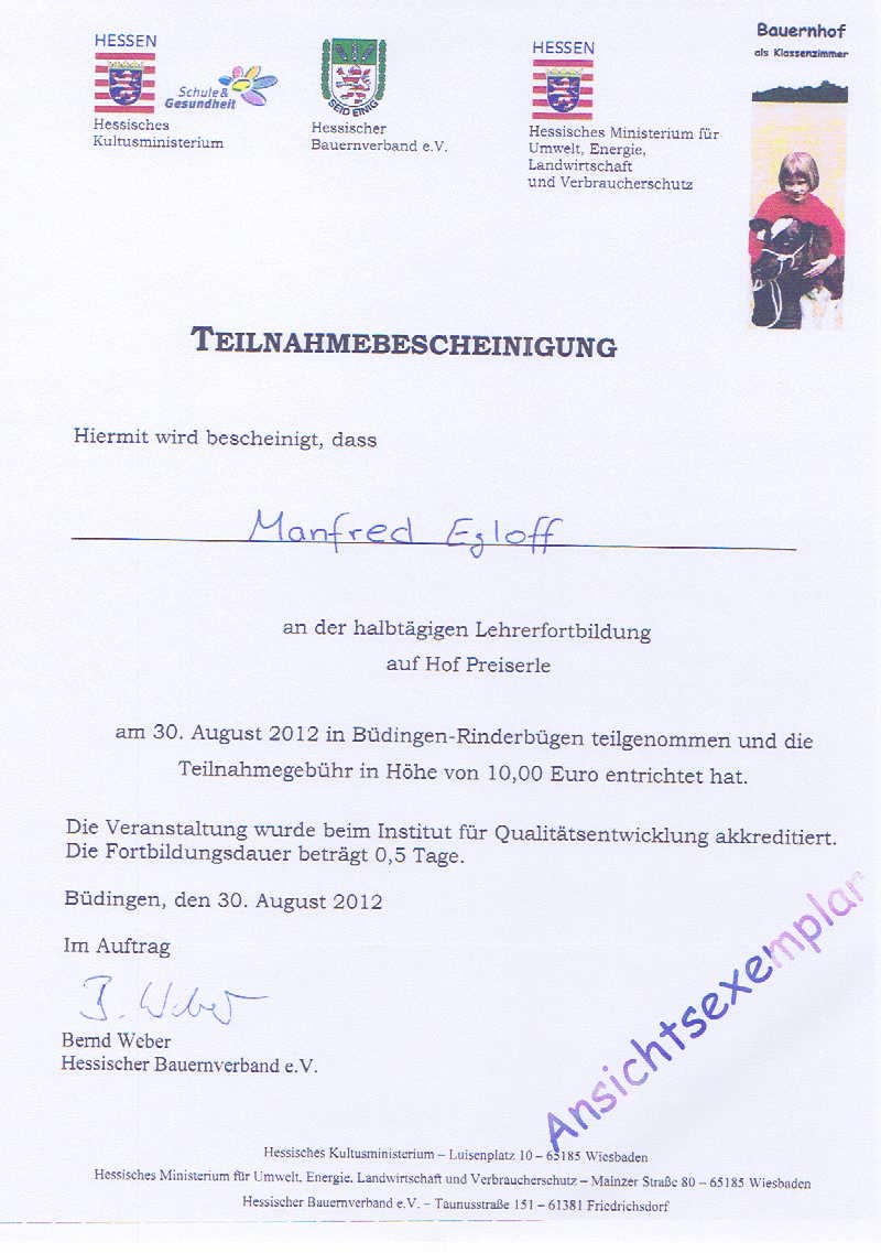Halbtägige Lehrerfortbildung am 30. August 2012 auf dem Hof Preiserle in Rinderbügen