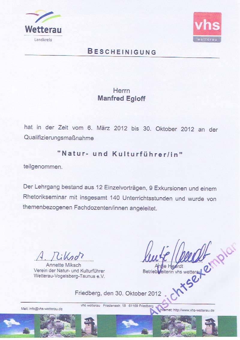 Mit 25 Kolleginnen und -kollegen habe ich von Februar bis Oktober 2012 an zwei Semestern mit 12 Unterrichts-Modulen und 10 Exkursionen an der Volkshochschule Wetterau teilgenommen und mich als Kultur- und Naturführer ausbilden lassen.