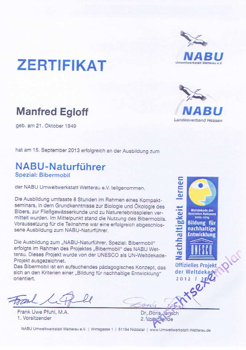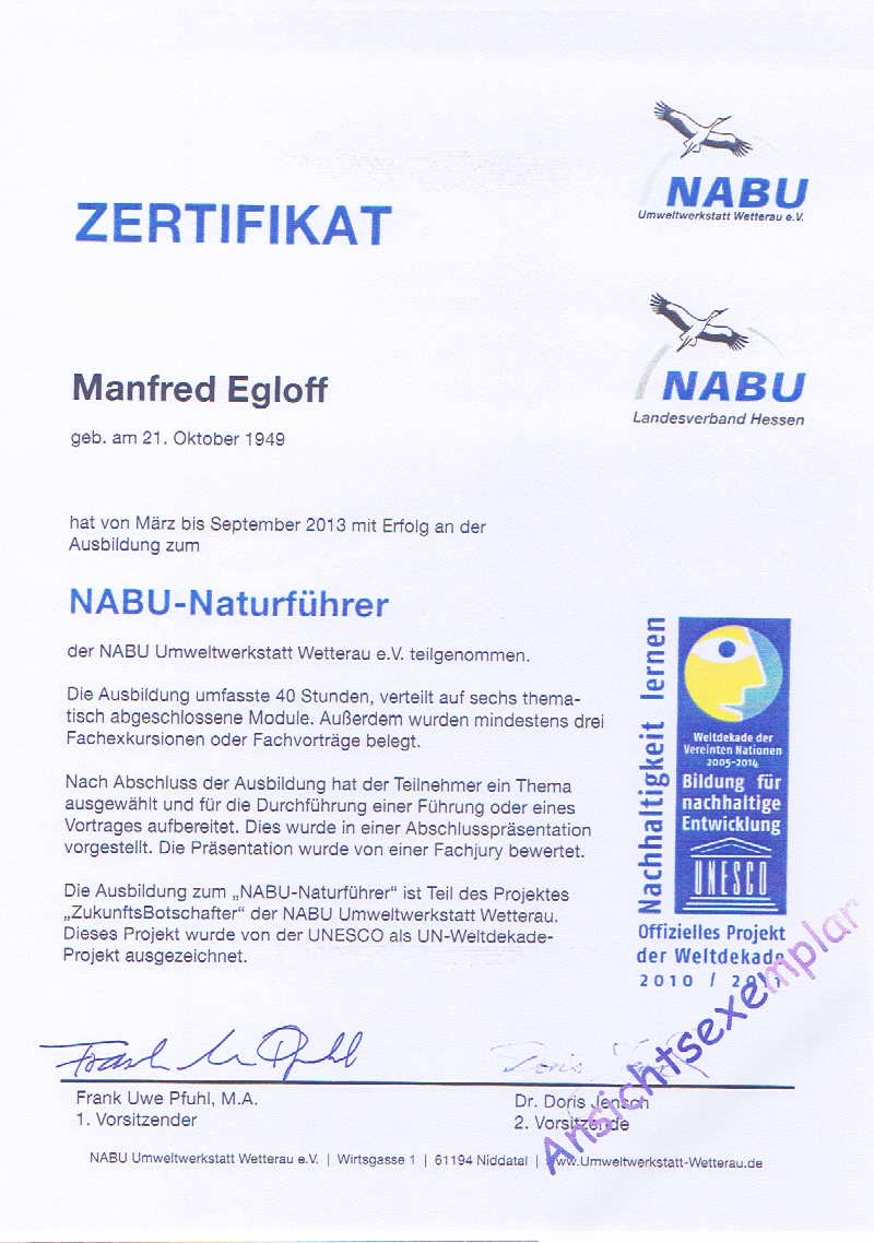 Mit 25 Kolleginnen und Kollegen habe ich von März bis Oktober 2013 an einem Ausbildungs- Seminar mit 6 Modulen und einer Abschluß- Präsentation bei der Umweltwerkstatt Wetterau teilgenommen und mich als NABU- Naturführer mit Zertifikat ausbilden lassen