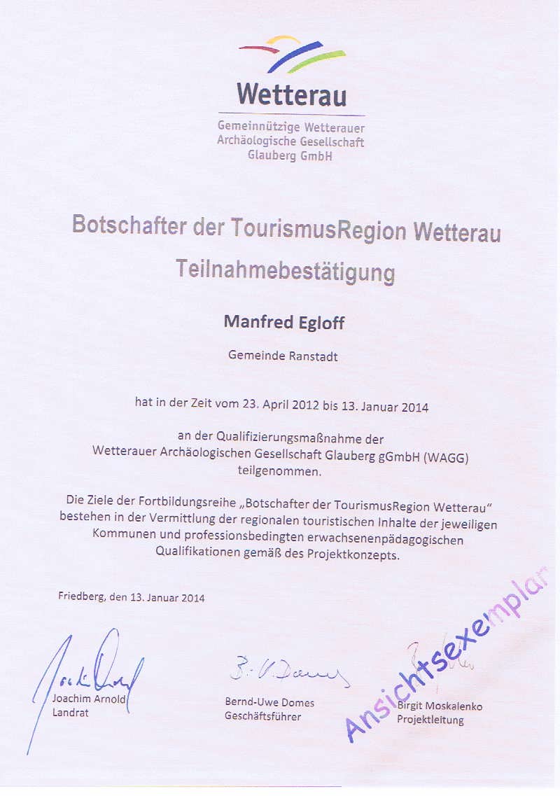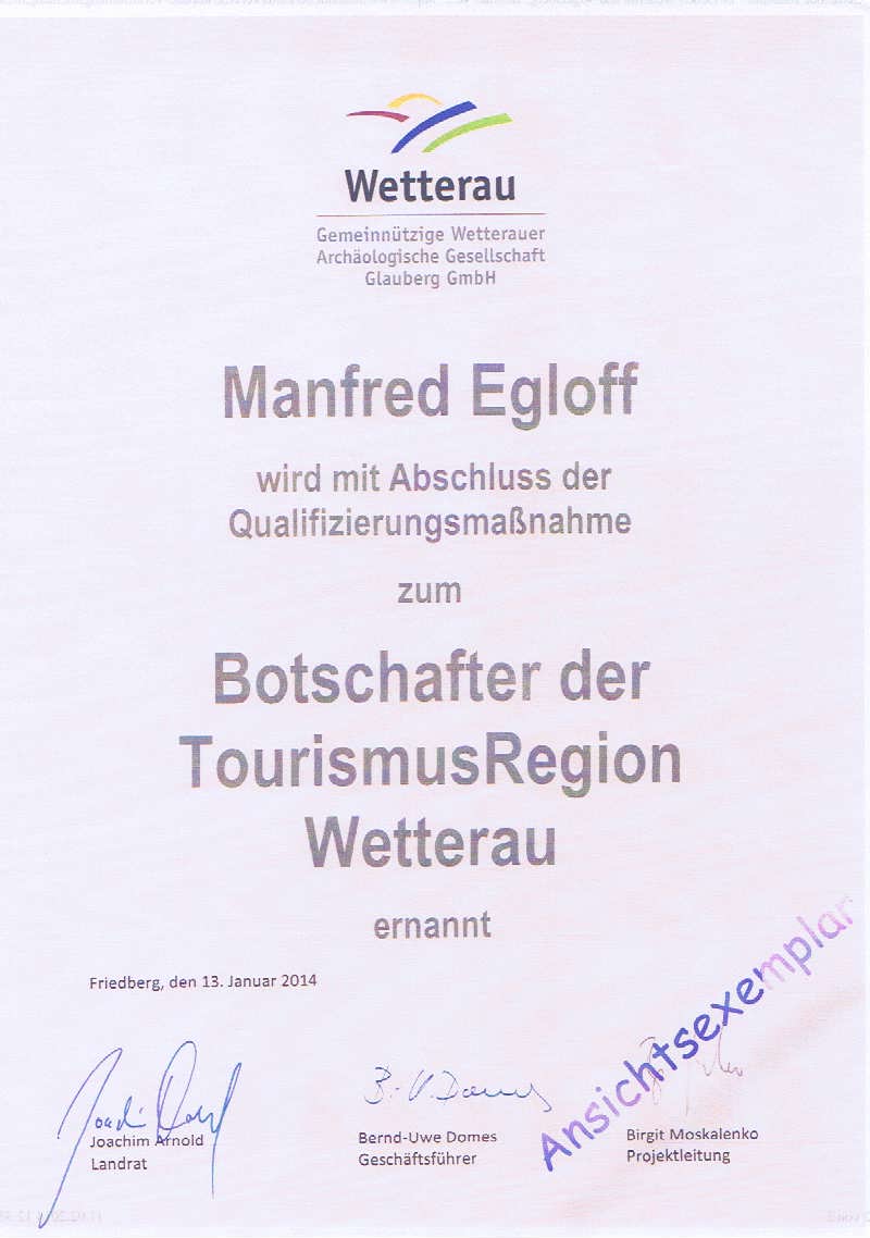 Wetterauer Archäologischen Gesellschaft Glauberg (WAGG) teilgenommen und bekam am 13. Januar 2014 aus den Händen des Landrates Joachim Arnold den Botschafterbrief.